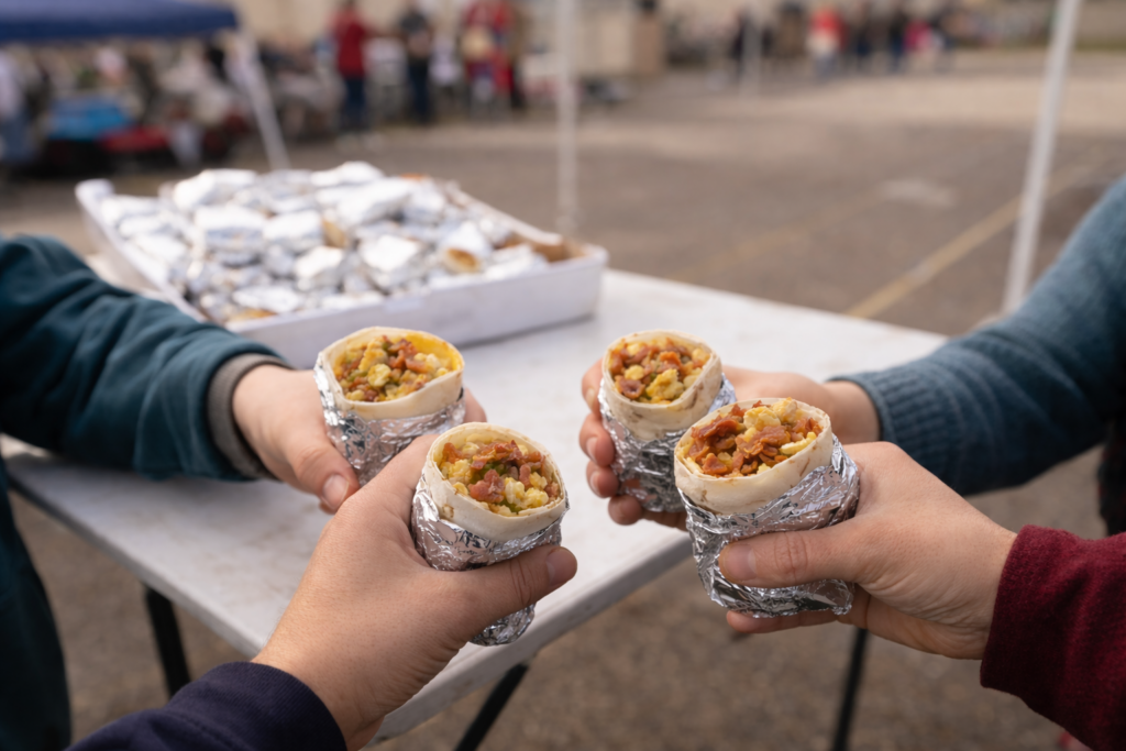 Start your morning with a free breakfast burrito on us. Come early, grab some food, and meet friendly people before service begins.
